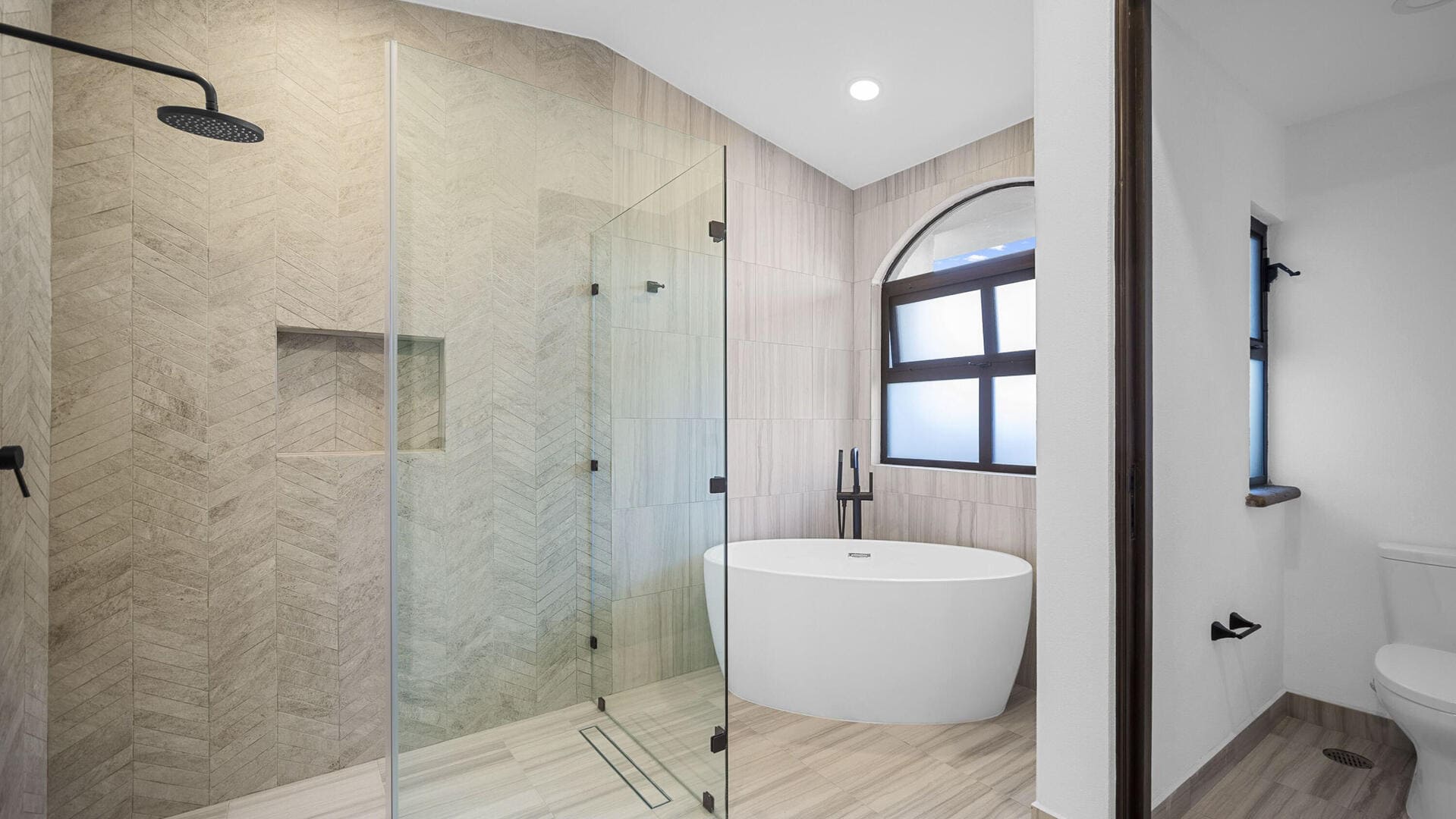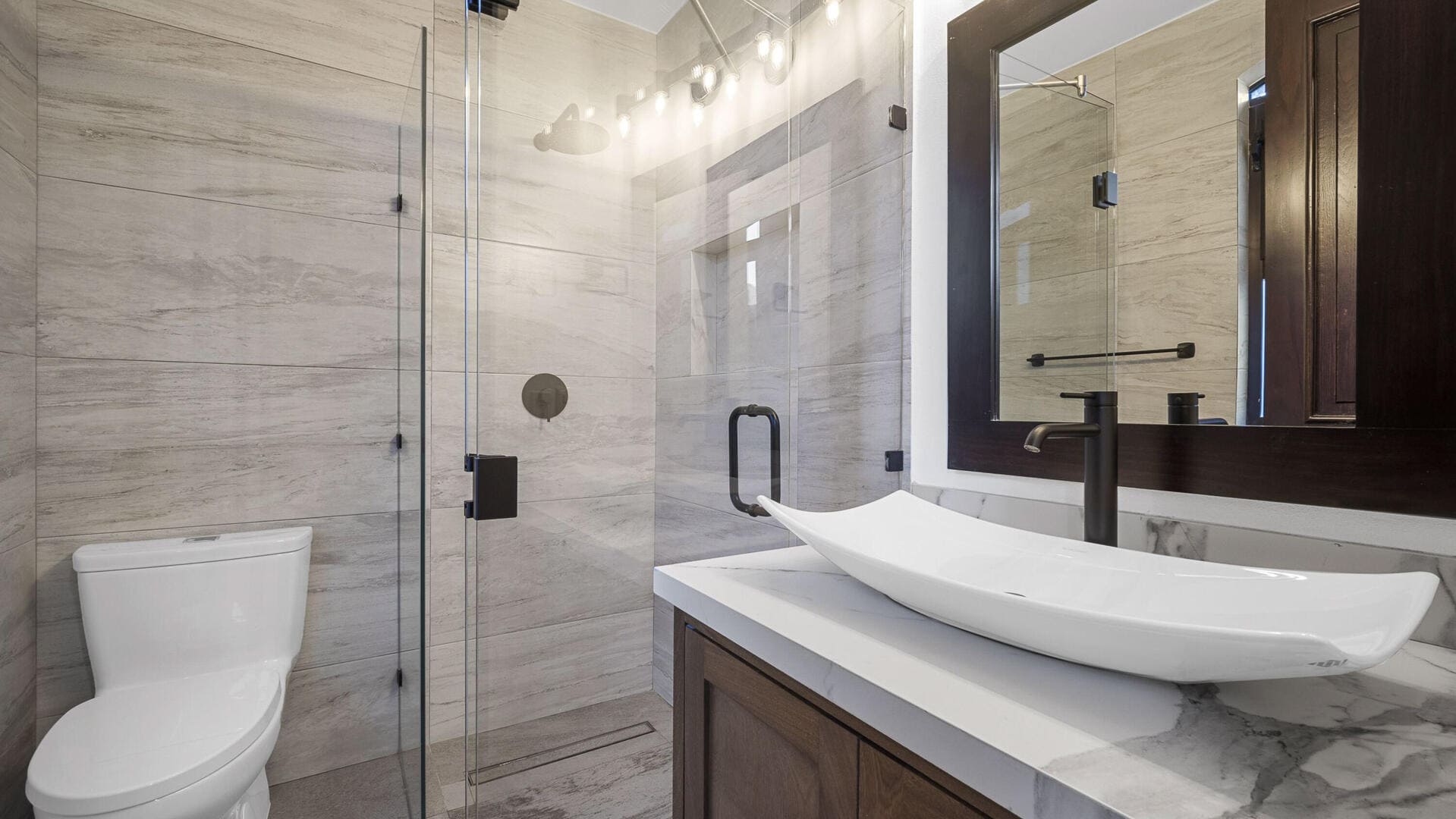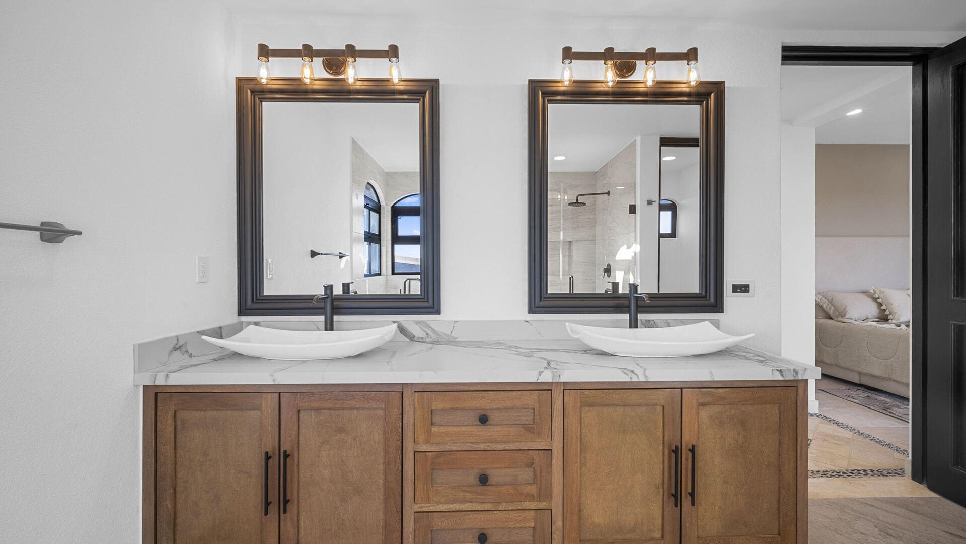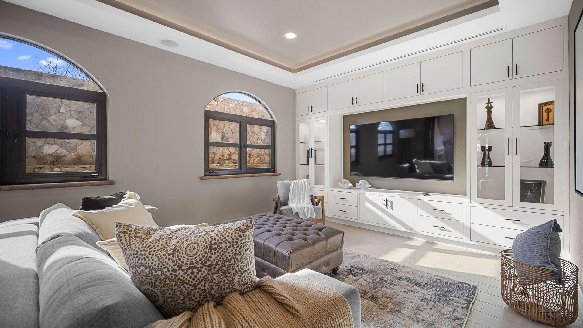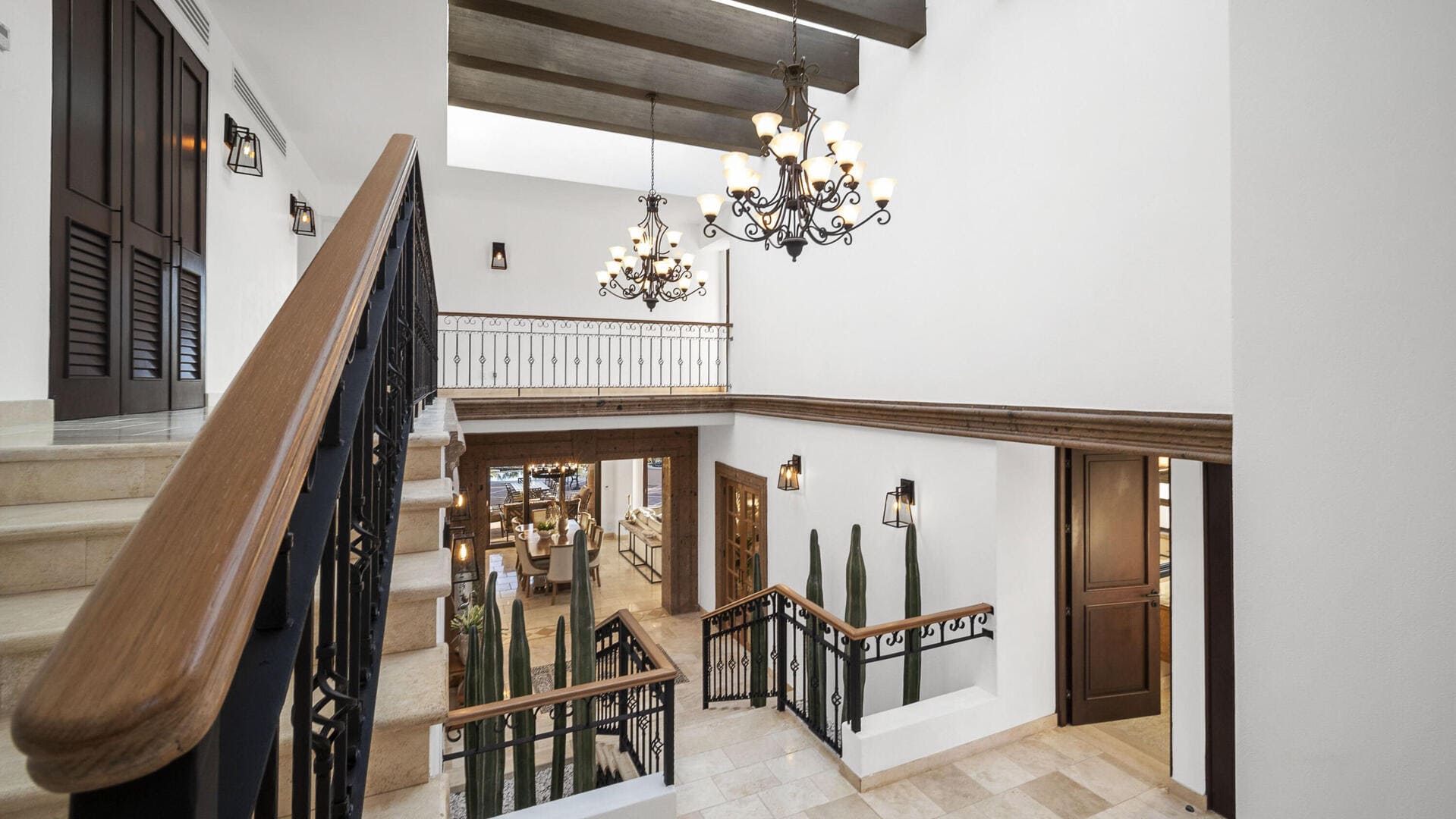 - Stone + wood finishes, vaulted ceilings, luxury décor