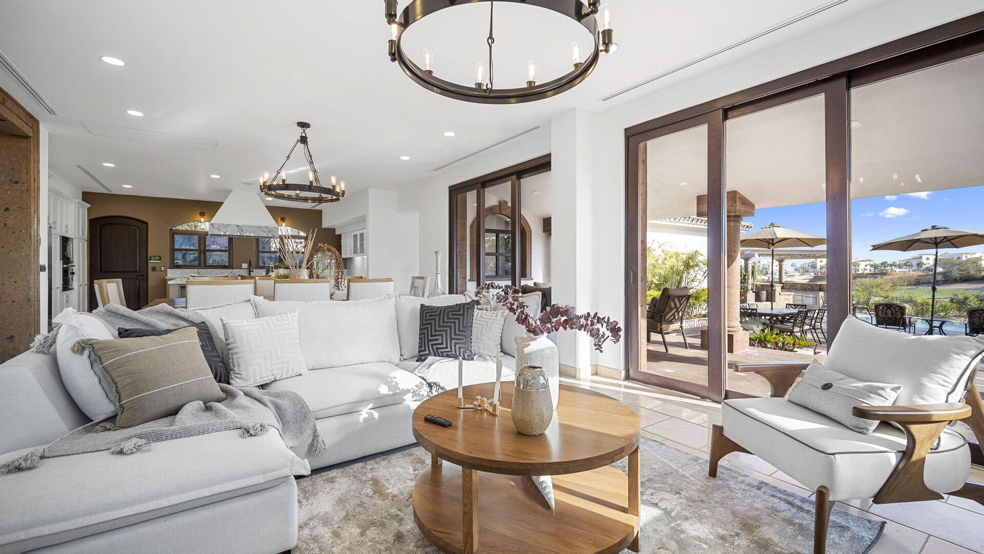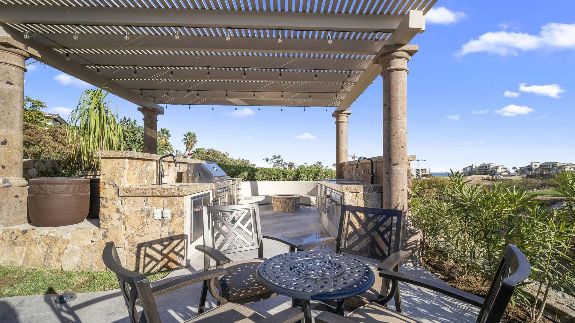 Guests enjoy a gourmet, fully-equipped kitchen, expansive indoor living and dining spaces, and an outdoor realm that invites indulgence: a private pool, jacuzzi, outdoor kitchen & BBQ, fire-pit seating and terraces overlooking both the golf course and ocean. With dedicated concierge service and daily housekeeping, every detail of your stay is curated to be seamless and luxurious.