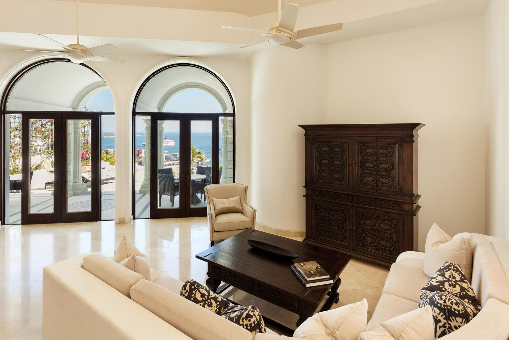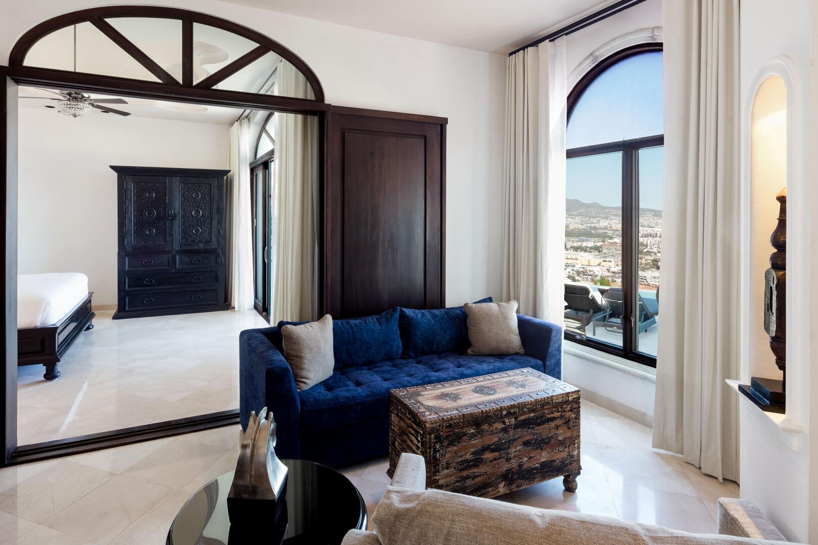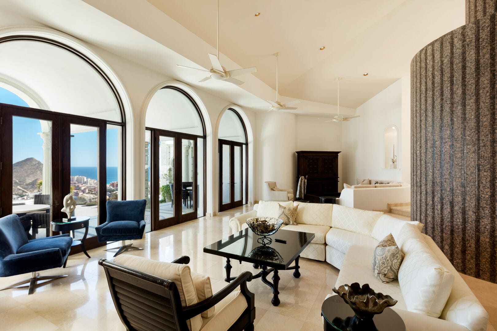 Spanning approximately 7,900 sqf, Villa Playamar unfolds across multiple levels, each terrace and lounge revealing a fresh perspective of the Pacific horizon and Cabo’s vibrant marina. Interiors are bathed in natural light, with floor-to-ceiling glass, open layouts and seamless indoor-outdoor flow.